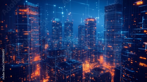 Nighttime view of a technologically advanced city with sleek, illuminated skyscrapers. Premium background for the latest technology needs