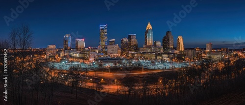 Nighttime View of Charlotte Skyline with Trees in Foreground