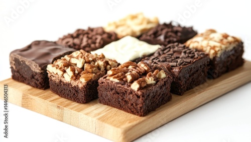 Nine Assorted Brownies with Nuts and Sprinkles on Wooden Board