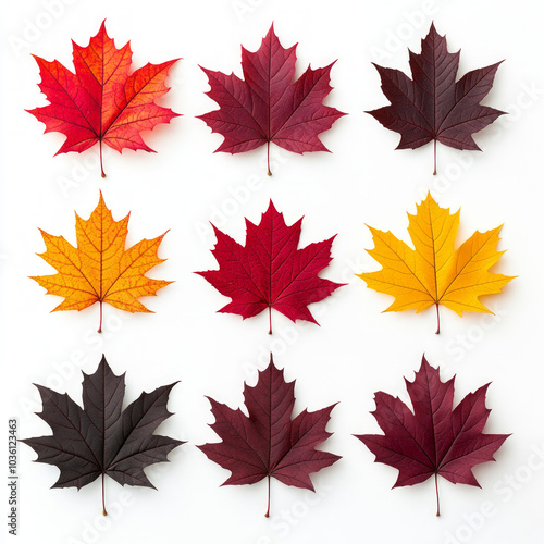Nine autumn leaves in various shades of red, yellow, and burgundy arranged in a grid against a white background.