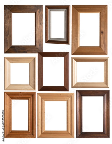 Nine empty picture frames of varying wood tones and sizes against a white background