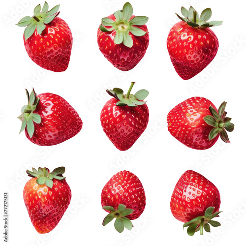 Nine vibrant red strawberries surrounded by green leaves on a transparent background