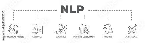 NLP banner web icon illustration concept for Neuro-linguistic programming with icon of neurological process, langauge, experience, personal development, coaching, and achieve goal