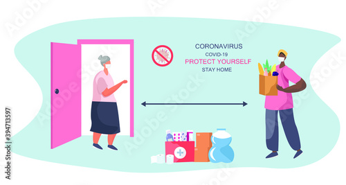 No Contact Home Delivery. Delivery Food and Drug During Quarantine.Online Shopping. Delivery Afro American Woman in Mask Leaves Food and Water for Pensioner.Social Distance.Flat Vector Illustration