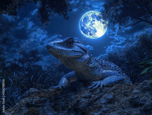 Nocturnal Reptile in Moonlit Jungle, Night Spirit, Exotic Lizard, Dark Forest, Wildlife Photography, Mystical Creature, Reptile in Moonlight, Jungle Textures, Nighttime Wildlife, Reptile Portrait