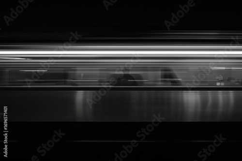 Nocturnal Scene Featuring a Moving Passenger Train with a Blurry Backdrop in Monochrome