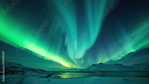 Northern Lights Aurora Borealis in Starry Night Sky - Breathtaking Green and Blue Arctic Phenomenon Panorama with Text Space