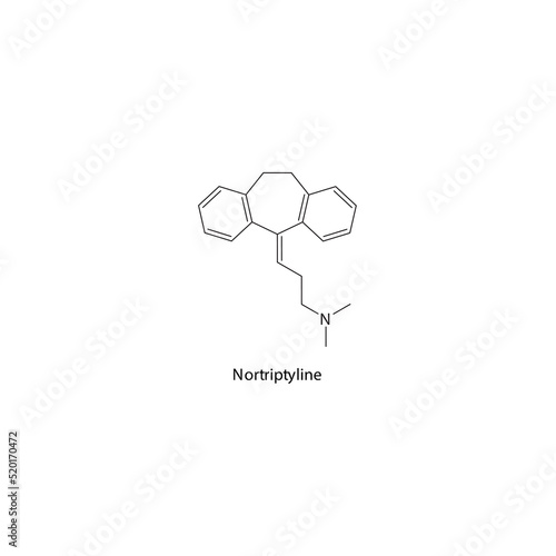 Nortriptyline molecule flat skeletal structure, TCA - Tricyclic antidepressant class drug used in depression treatment. Vector illustration on white background.