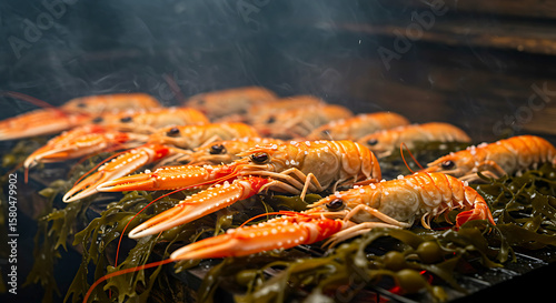 Norwegian Røkt Sjøkreps. langoustines smoking over damp kelp beds, sea salt crust locking in briny flavor, driftwood smokehouse