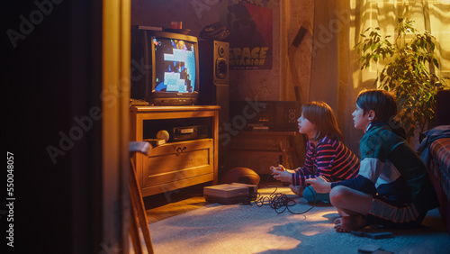 Nostalgic Childhood Concept: Young Brother and Sister Playing 8 Bit 2D Arcade Video Game on a Retro TV Set at Home in a Room with Period-Correct Interior. Friends Are Winning Together.