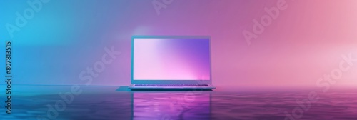 Notebook computer or laptop painted in white with vibrant bold gradient purple and blue holographic color lights. Concept art. Minimal office surrealism
