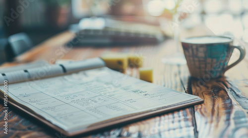 Notebook for notes and scheduling lying open on a wooden table, surrounded by pens and a coffee cup. Organization, productivity, and planning concept. Work, study, and daily routine.