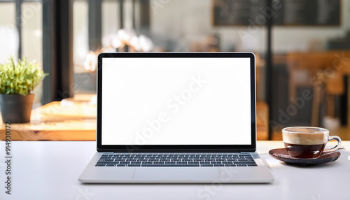 Notebook laptop white screen mockup is on a white table in simple minimal coffee shop