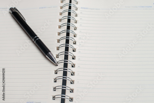 Notebook with black pen, Colorful notepads on the desk, Glasses on the desk with pen and cup of coffee, Computer keyboard with colorful note stick