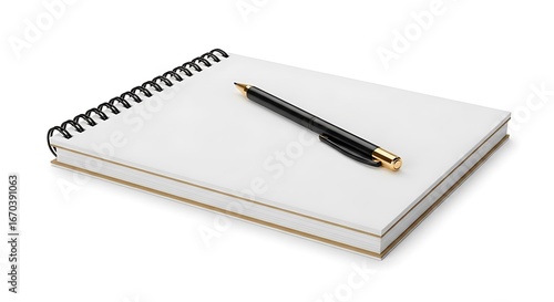 Notebook with Pen, Ready for Writing: Black and Gold Pen Resting on Blank White Page, Spiral Notebook with Pen Mockup - Ready for Your Ideas and Designs