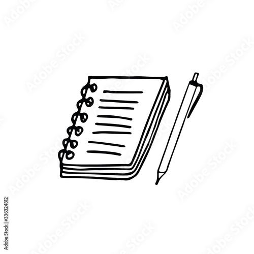 notepad on spiral rings with pen and notes hand drawn in doodle style. Scandinavian simple monochrome. single element, icon, sticker stationery
