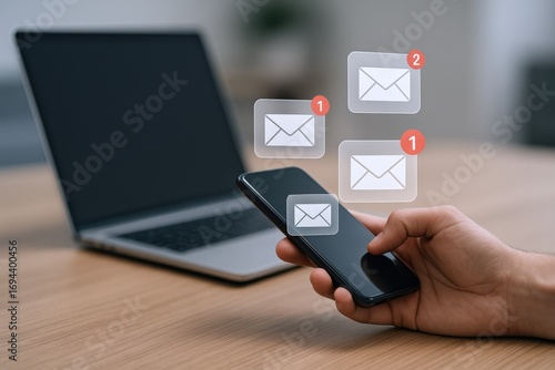 Notifications Concept: Hand Holding Mobile Phone with Email Icons, Laptop in Background, Indicating Communication