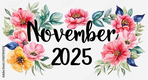 november 2025 word lettering with watercolor painting flowers on plain white background