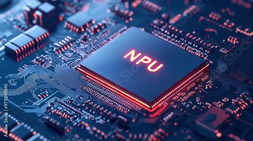 NPU Chip on a High-Tech Circuit Board with Glowing Connections