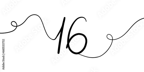 Number 16 line art drawing on white background. 16th birthday continuous drawing contour. Minimal vector illustration