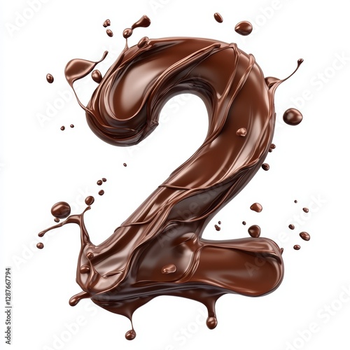 Number 2 made of thick melted dark chocolate splashes with swirling glossy waves isolated on a clean white background