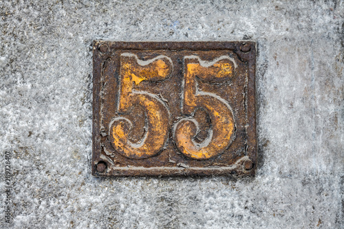 Number 55, fifty five, street number sign on the wall