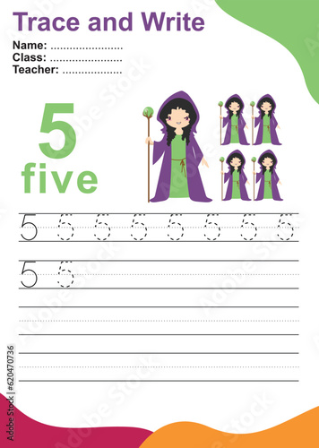 Number five tracing practice worksheet with five evil witch for kids learning to count and to write. Vector Illustration. Exercise for children to recognize the number.