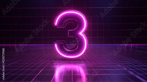 Number three in a smooth matte black design, illuminated with neon purple and pink rim lighting