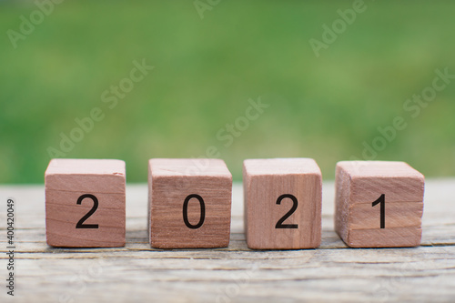 Number written to wooden blocks, 2021 new year card congratulation concept with copy space