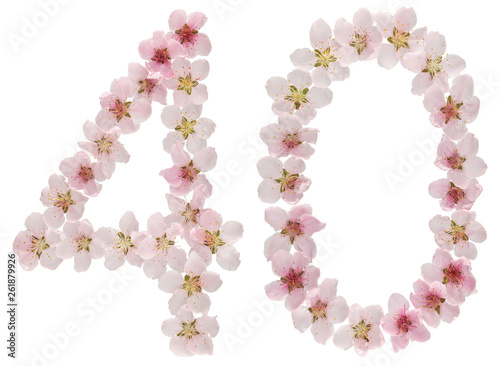 Numeral 40, forty, from natural pink flowers of peach tree, isolated on white background