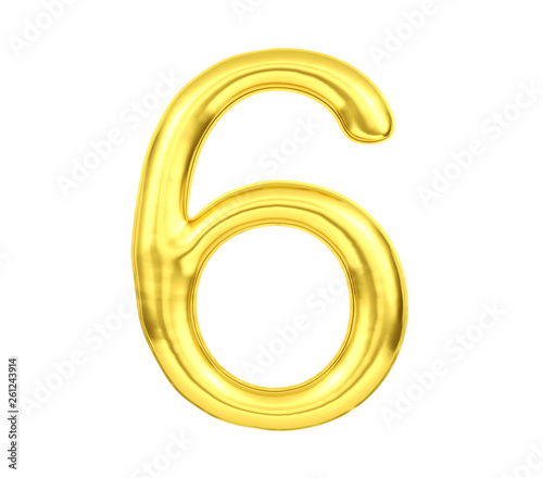 Numeral 6, Golden balloon number six isolated on white background, 3D Rendering