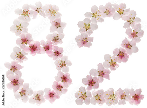 Numeral 82, eighty two, from natural pink flowers of peach tree, isolated on white background