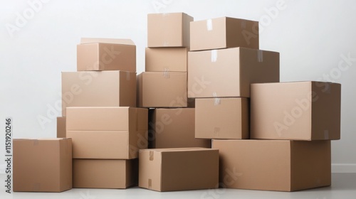 Numerous cardboard boxes are stacked in an organized manner within a bright, spacious room.