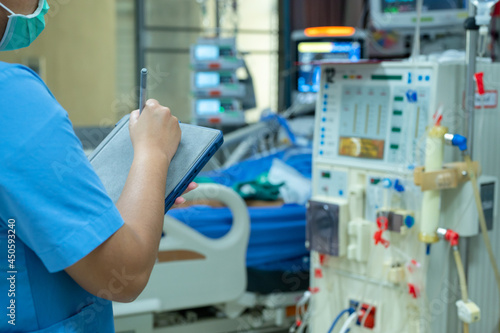 Nurses are checking the function of the hemodialysis machine before use in patients with chronic renal failure.