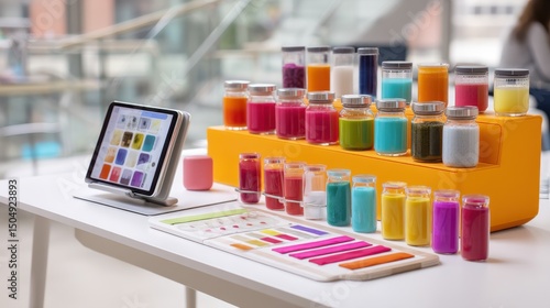 nutrition education session type. Colorful jars of paint arranged on a table with a tablet display.
