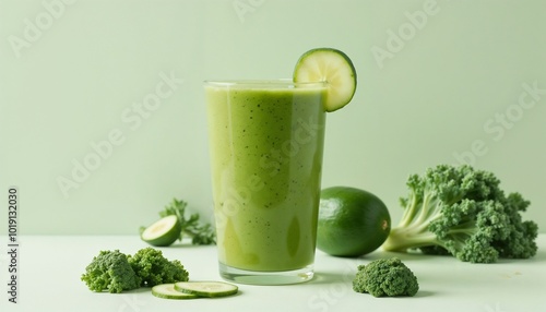 Nutritious green smoothie with broccoli and lime in a glass on a green background for healthy eating lifestyle