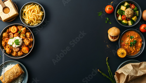 Nutritious meal delivery. Healthy diet dish assortment. Overhead shot. Blank space for text. Dark backdrop., vintage. with white shades