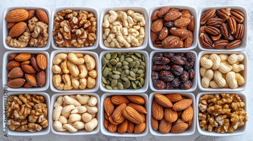 Nuts and seeds assortment in white bowls, showcasing various textures and colors, perfect for healthy snacking and culinary uses