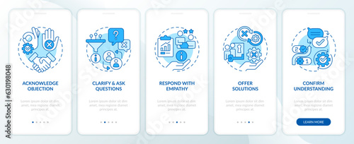 Objection handling process blue onboarding mobile app screen. Sales script walkthrough 5 steps editable graphic instructions with linear concepts. UI, UX template. Myriad Pro-Bold, Regular fonts used