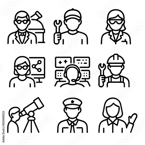 Observatory Staff Icons. Outline icon set of observatory staff: lead astronomer, technician, research assistant, data analyst,