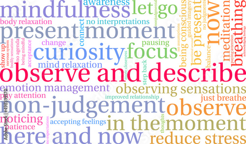 Observe and Describe During Mindfulness Word Cloud on a white background.