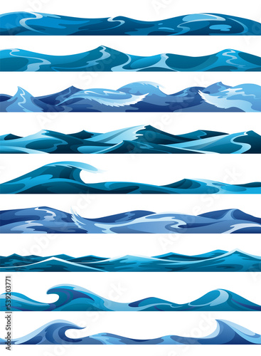 Ocean or sea decorative water waves. set of horisontal patterns for ui games. Stylized blue waves on white background