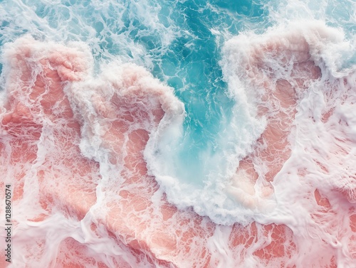 Ocean waves crash on the beach creating a mesmerizing blend of colors at sunrise in a coastal paradise