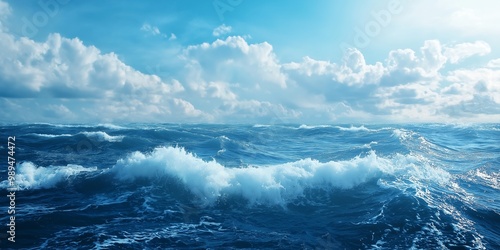 Ocean with waves rolling under a bright blue sky filled with scattered clouds.