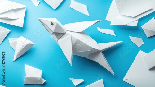 Oceanic origami, A playful scene with a paper seal on blue surface