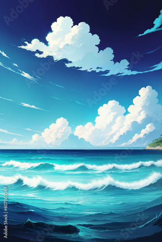 Oceantic water waves, Colorful Cartoon-Realistic Style, Children's Book Illustrations, Environmental Awareness Campaigns, Video Game Backgrounds. Rich Greenery Details for Nature-inspired Design