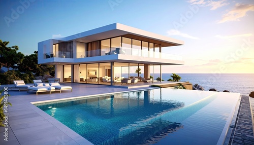 Oceanview Luxury Modern Villa with Infinity Pool at Sunset.