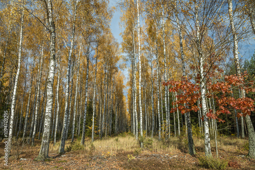 october landscape - autumn sunny day, beautiful trees with colorful leaves, Poland, Europe, Podlasie, white clouds on blue sky birch forest