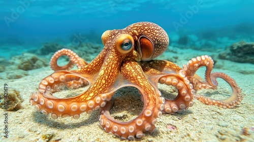 Octopus exploring the ocean floor, tentacles reaching and feeling around in a mesmerizing pattern.