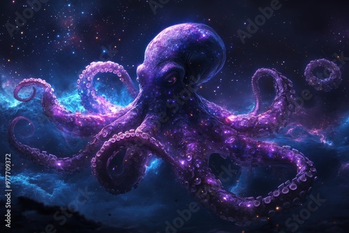 Octopus Floating Through the Cosmos with Bioluminescent Glow